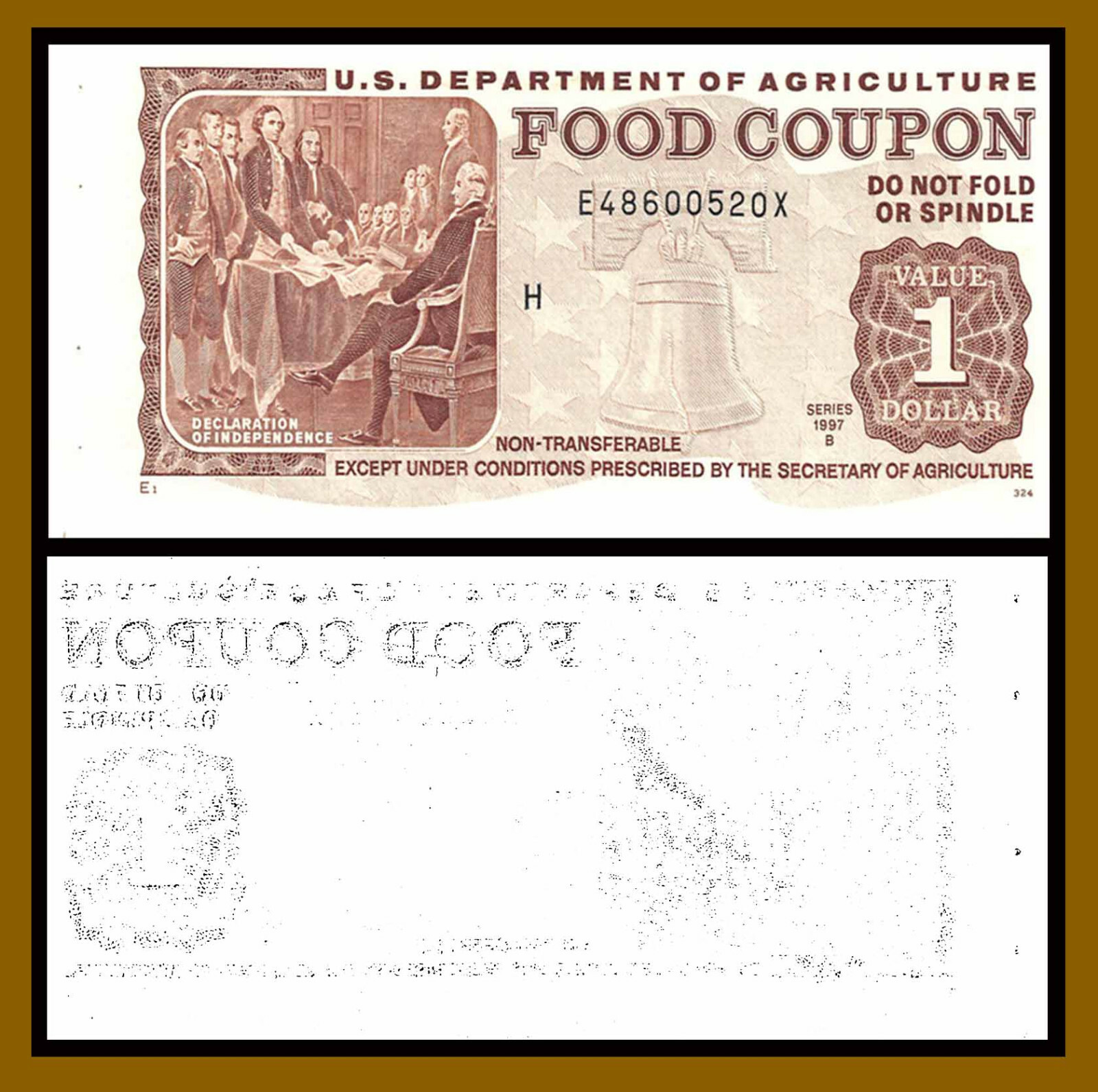 1 Dollar United States Department of Agriculture Food Coupon U.S. DEPARTMENT OF AGRICULTURE FOOD COUPON DO NOT FOLD OR SPINDLE VALUE 1 DOLLAR NON-TRANSFERABLE EXCEPT UNDER CONDITIONS PRESCRIBED BY THE SECRETARY OF AGRICULTURE DECLARATION OF INDEPENDENCE (image legend) SERIES (followed by year and/or prefix ex 1995, 2000 B) plate numbers and position ex: E4 403 serial number ex E02157997U Reverse