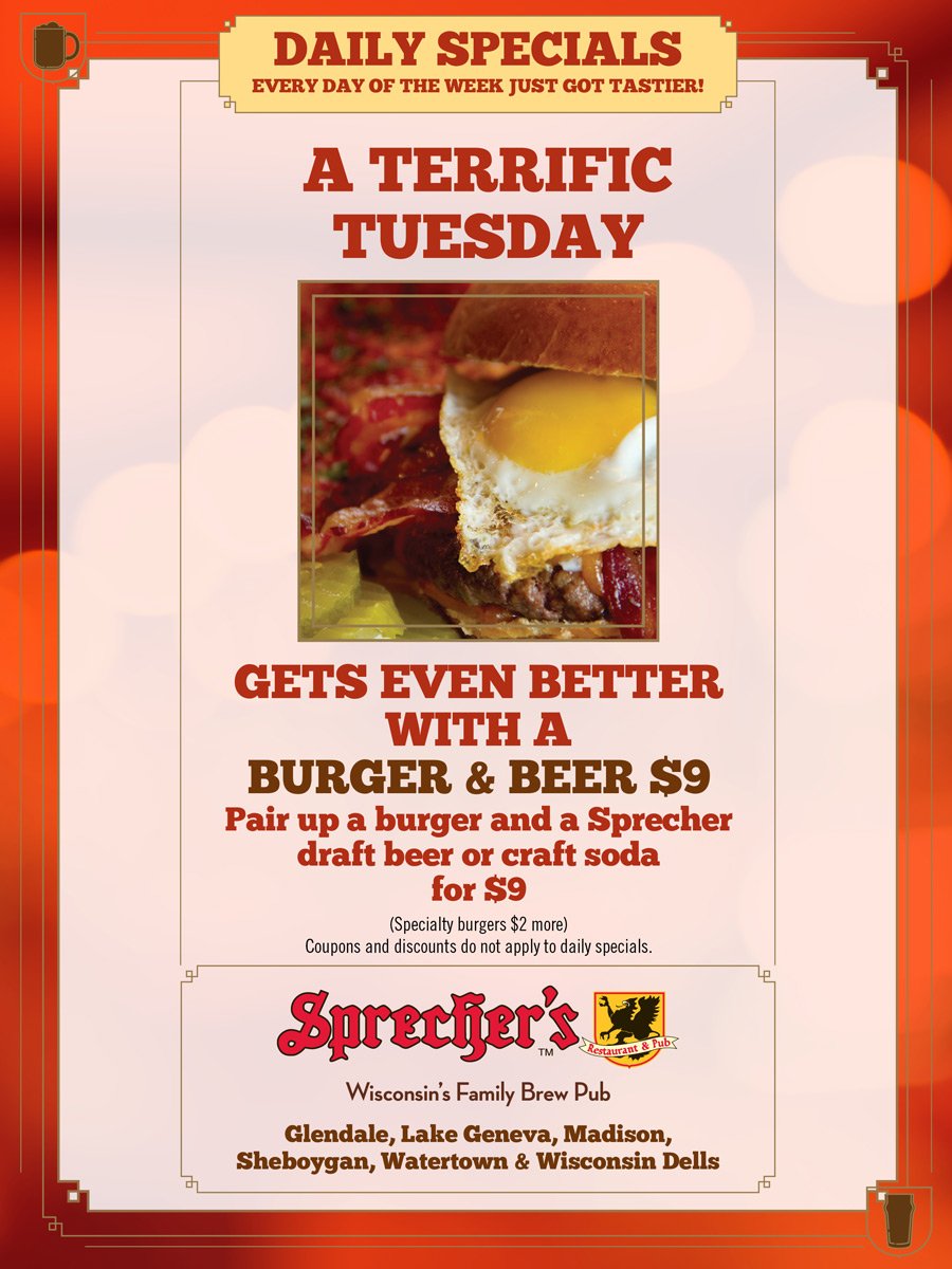 $5 OFF Sprecher's Restaurant & Pub Coupons & Promo Deals - Lake Geneva, WI March 2022 - Click for $5 off Sprecher's Restaurant & Pub Coupons in Lake Geneva, WI. Save printable Sprecher's Restaurant & Pub promo codes and discounts.